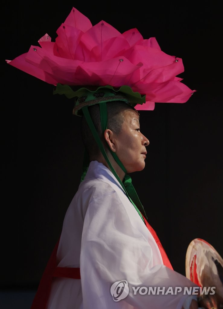 (서울=연합뉴스) 김예나 기자 = 구성진 태평소 소리가 시작을 알리자 하얀 장삼 위로 붉은 천을 드리운 주인공이 등장했다. 한 걸음, 또 한 걸음.