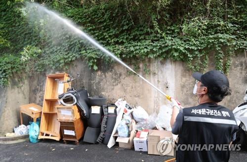 | ▲ Seoul municipal officials conduct disinfection work against lovebugs in the northwestern ward of Seodaemun on July 4, 2022. (Yonhap) |