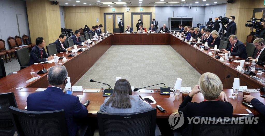 | ▲ North Atlantic Treaty Organization Parliamentary Assembly officials hold a meeting with members of the parliamentary defense committee at the National Assembly on Oct. 19, 2022. (Pool photo) (Yonhap) |