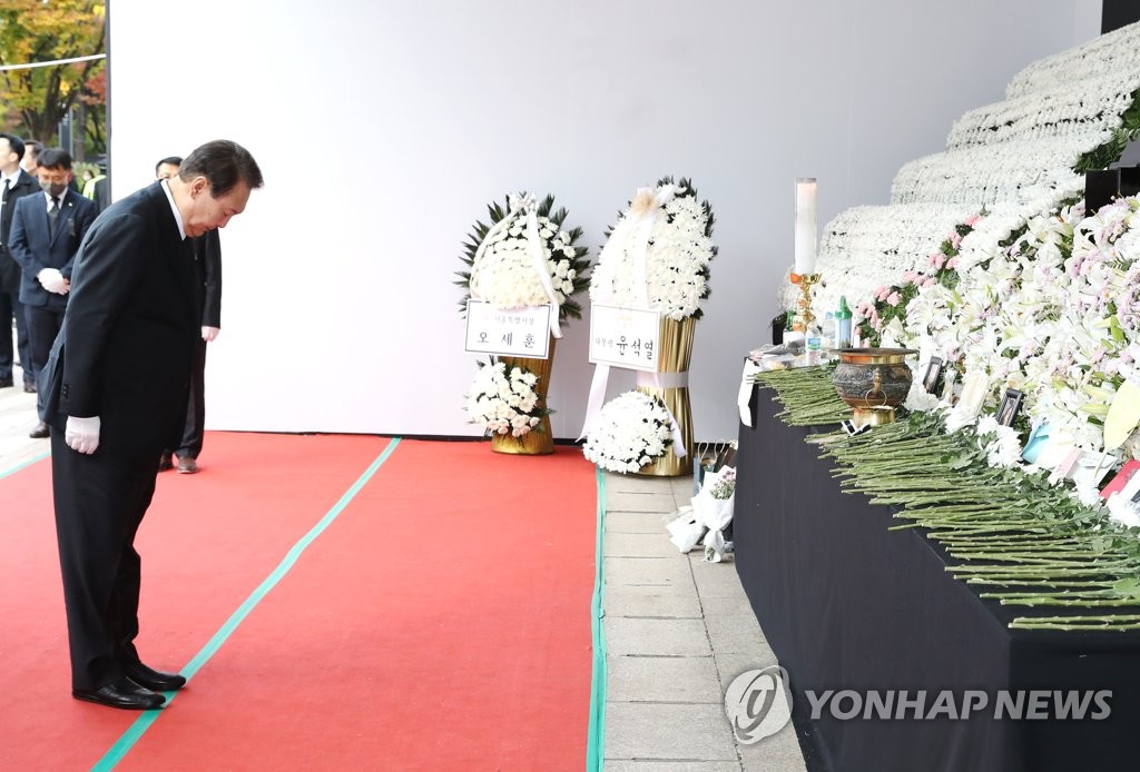SEOUL, Nov. 3 (Yonhap) -- President Yoon Suk-yeol instructed his aides Thursday to set up a "one-stop" support center where families of victims and others affected by the Halloween crowd crush can continue to receive medical and other assistance after the national mourning period ends.