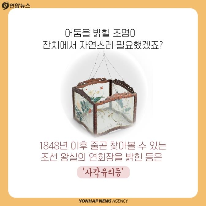 1848년 이후 줄곧 찾아볼 수 있는 조선 왕실의 연회장을 밝힌 등은 '사각유리등'. 세로 44.7cm, 가로 44.4cm, 높이는 37.4cm의 작지 않은 크기입니다.