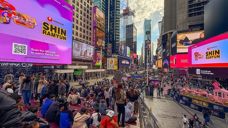 | ▲ This file photo provided by Nongshim Co. on Oct. 20, 2025, shows its campaign in New York to promote ramyeon, or instant noodle products. (PHOTO NOT FOR SALE) (Yonhap) |
