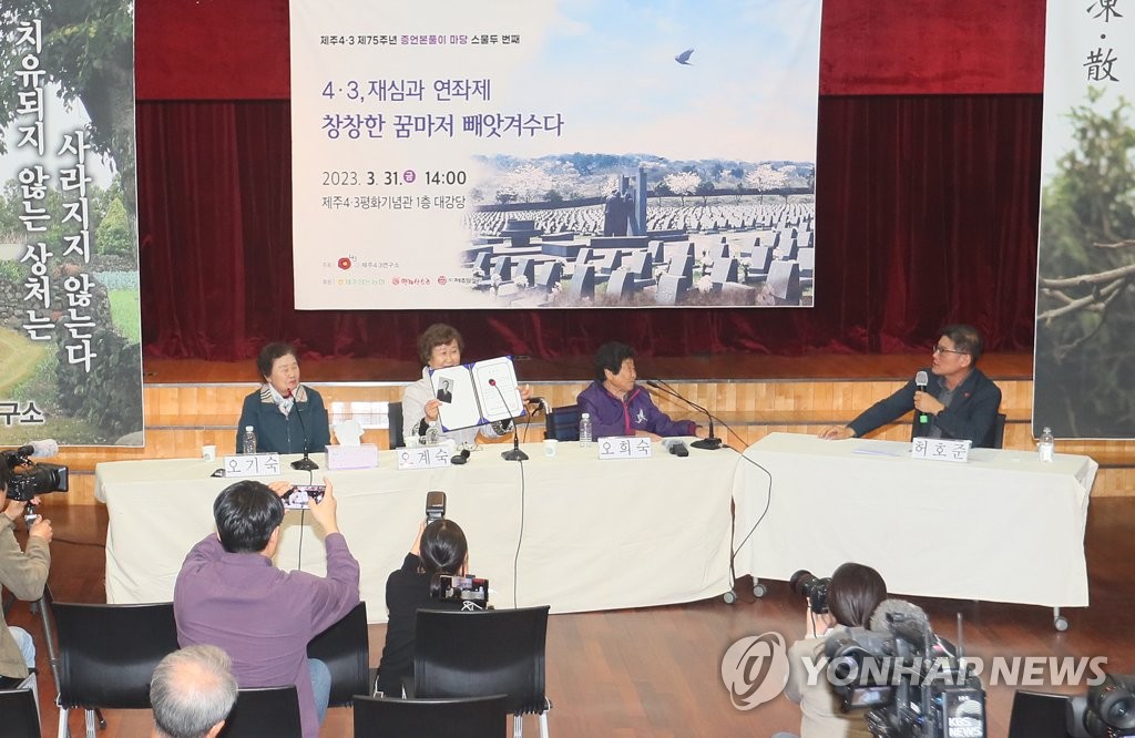 | ▲ 제주4·3 증언 본풀이 마당 (제주=연합뉴스) 전지혜 기자 = 31일 제주4·3평화기념관 대강당에서 열린 4·3 증언 본풀이 마당에서 오희숙·오계숙·오기숙 세 자매가 사연을 말하고 있다. 2023.3.31 atoz@yna.co.kr |