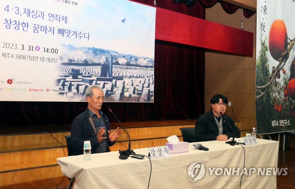 | ▲ 제주4·3 증언 본풀이 마당 (제주=연합뉴스) 전지혜 기자 = 31일 제주4·3평화기념관 대강당에서 열린 4·3 증언 본풀이 마당에서 4·3 유족 양성홍(왼쪽)씨가 사연을 말하고 있다. 2023.3.31 atoz@yna.co.kr |