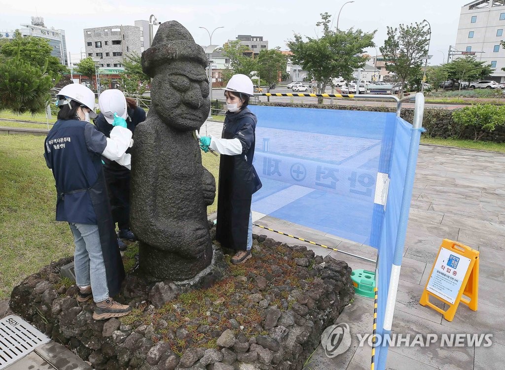 문화재인 돌하르방 세척은 전문가만이 할 수 있다.