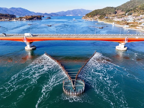 죽방렴 어업은 남해 지족해협의 거센 물살을 이용한 전통 어로 방식이다.
