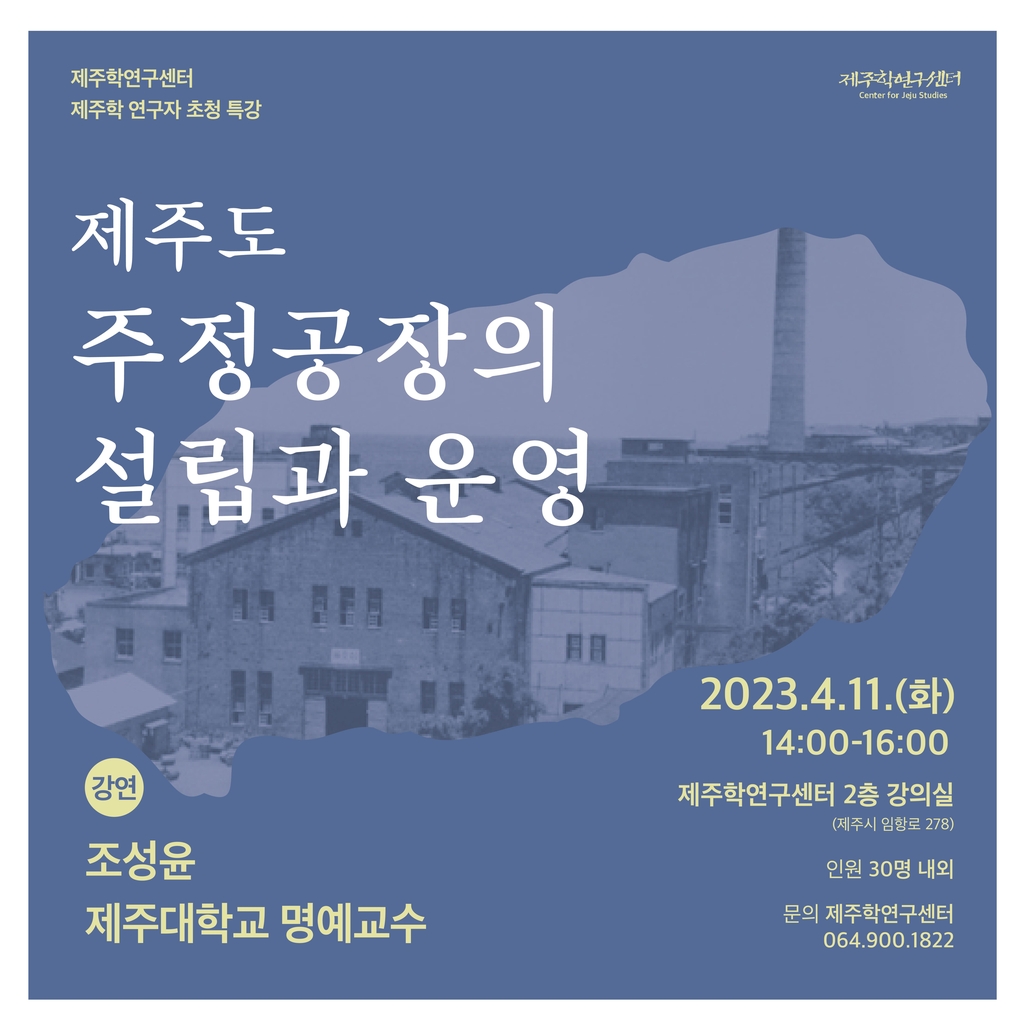 그 첫 번째 순서로 2022년 제주학연구센터의 '제주학 연구비 공모지원 사업'의 과제로 선정돼 수행된 '동양척식회사 직영 제주도 주정공장의 설립과 운영'을 주제로 조성윤 제주대학교 명예교수가 연사로 나선다.