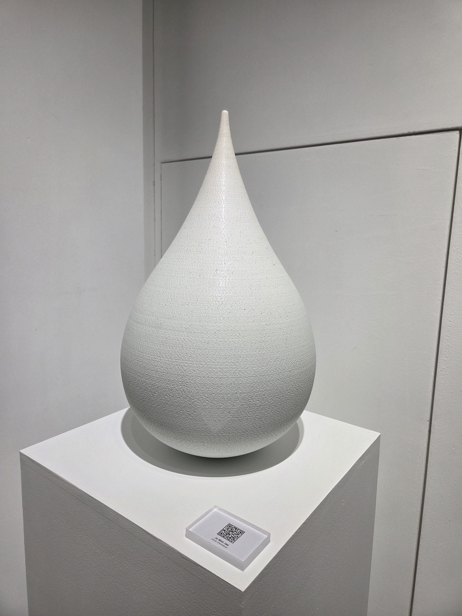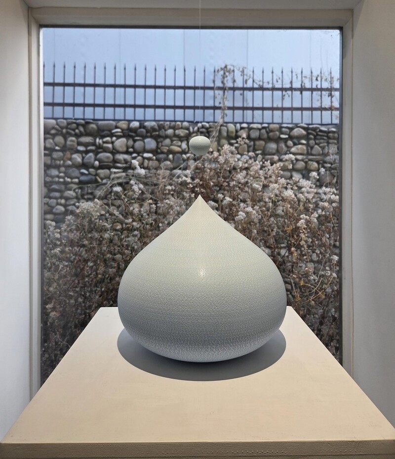 전시에 내놓은 대표 연작 '푸른 물방울'은 물방울이 떨어지며 중력에 의해 길쭉해지는 찰나의 모습을 도자기로 표현한 작품이다. 주둥이가 없는 형태로 물방울의 순간성을 강조했다.