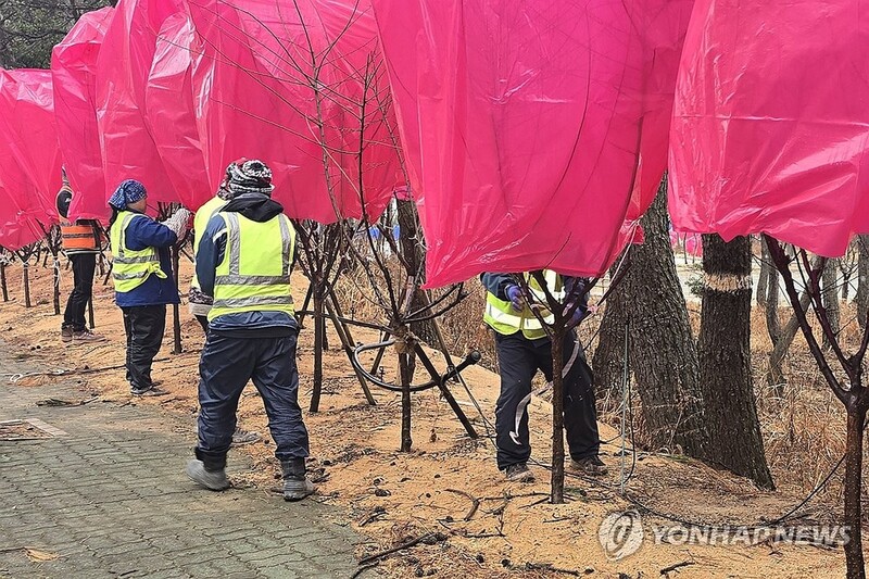 | ▲ 지난해 신안 홍매화축제 개막 전 한파에 방풍막 씌운 매화나무 [전남 신안군 제공. 재판매 및 DB 금지] |