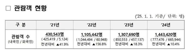 연간 관람객은 코로나19 사태가 한창이던 2021년 43만543명까지 떨어졌으나 이후 110만5천442명, 130만7천690명, 144만3천420명 등 3년 연속 100만명대를 기록한 바 있다.