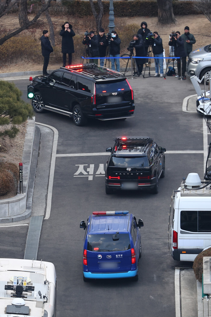 A justice ministry vehicle (bottom, blue) carrying detained President Yoon Suk Yeol enters the Constitutional Court in Seoul on Feb. 25, 2025, as Yoon will attend the 11th and final hearing of his impeachment trial in connection to his short-lived imposition of martial law in December. (Yonhap)