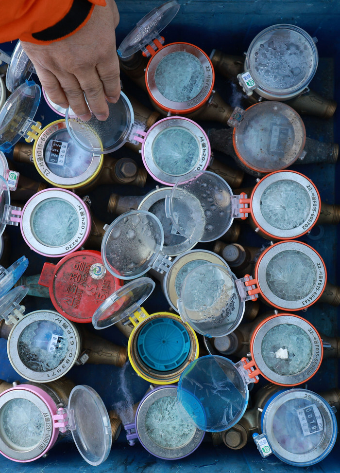 An employee sorts frozen water meters that broke due to the cold weather at a water management office in Seoul's Gangbuk Ward on Dec. 26, 2025, as the Seoul metropolitan government issued a warning against water meter ruptures amid a cold snap gripping the country. (Yonhap)