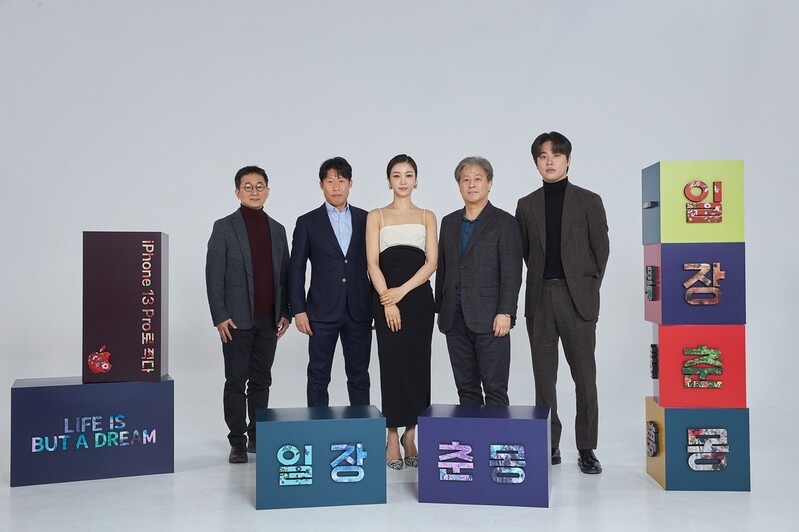 ▲ This photo provided by Apple shows "Life is But a Dream" director Park Chan-wook (2nd from R), its cast and crew posing during a press conference streamed on Feb. 18, 2022. (PHOTO NOT FOR SALE) (Yonhap)
