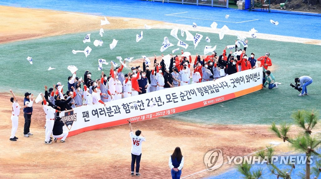 | ▲ Members of the SK Wyverns take part in the "Goodbye, Wyverns" event after an intrasquad game at Kang Chang-hak Baseball Stadium in Seogwipo, Jeju Island, on March 5, 2021. It was the final scrimmage prior to the Wyverns' name change under the new ownership by Shinsegae Group. (Yonhap) |