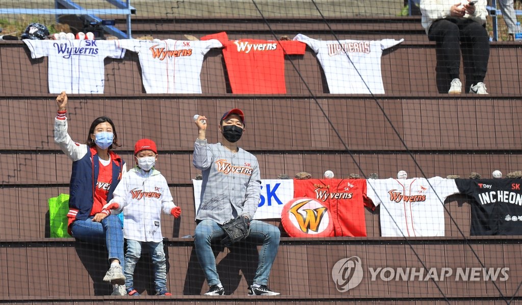 | ▲ Fans of the SK Wyverns cheer on their team during an intrasquad game at Kang Chang-hak Baseball Stadium in Seogwipo, Jeju Island, on March 5, 2021. It was the final scrimmage prior to the Wyverns' name change under the new ownership by Shinsegae Group. (Yonhap) |