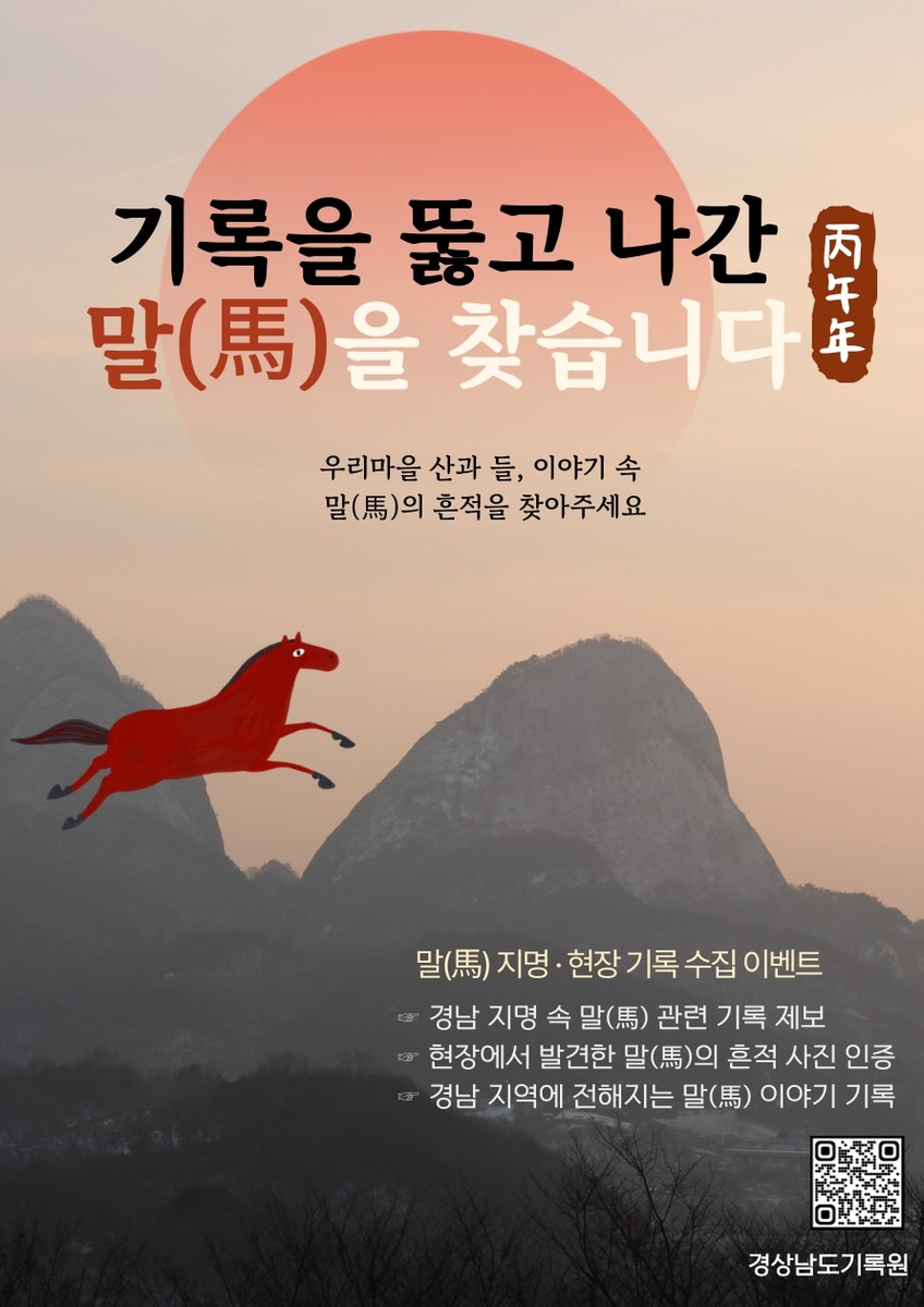 (창원=연합뉴스) 이정훈 기자 = 경상남도기록원은 2026년 '붉은 말'의 해를 맞아 '기록을 뚫고 나간 말(馬)을 찾습니다'란 테마로 말 관련 지명, 기억을 수집한다고 5일 밝혔다.