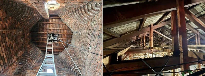 | ▲ 성당 내부 모습 필수보존요소로 검토하는 종탑 상부 조적벽 마감(왼쪽), 지붕 트러스 구조 (오른쪽) [국가유산청 제공. 재판매 및 DB 금지] |