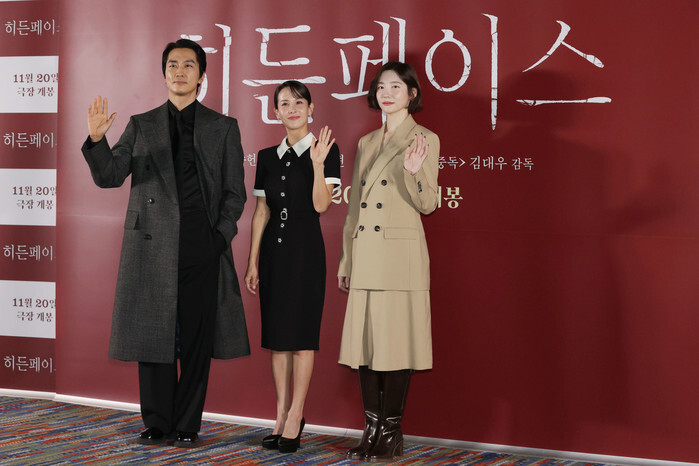 The stars of the new movie "Hidden Face" -- Song Seung-hun, Jo Yeo-jung and Park Ji-hyun (L to R) -- pose for a photo during an event in Seoul on Nov. 13, 2024, to promote the movie, set to hit local screens in South Korea on Nov. 20. (Yonhap)