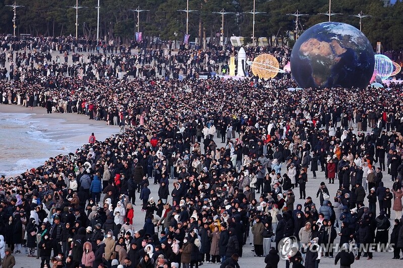 | ▲ 해운대 해맞이 인파 (부산=연합뉴스) 손형주 기자 = 1일 오전 부산 해운대해수욕장에서 병오년 첫해를 보기 위해 많은 시민들이 모여 있다. 2026.1.1 handbrother@yna.co.kr |