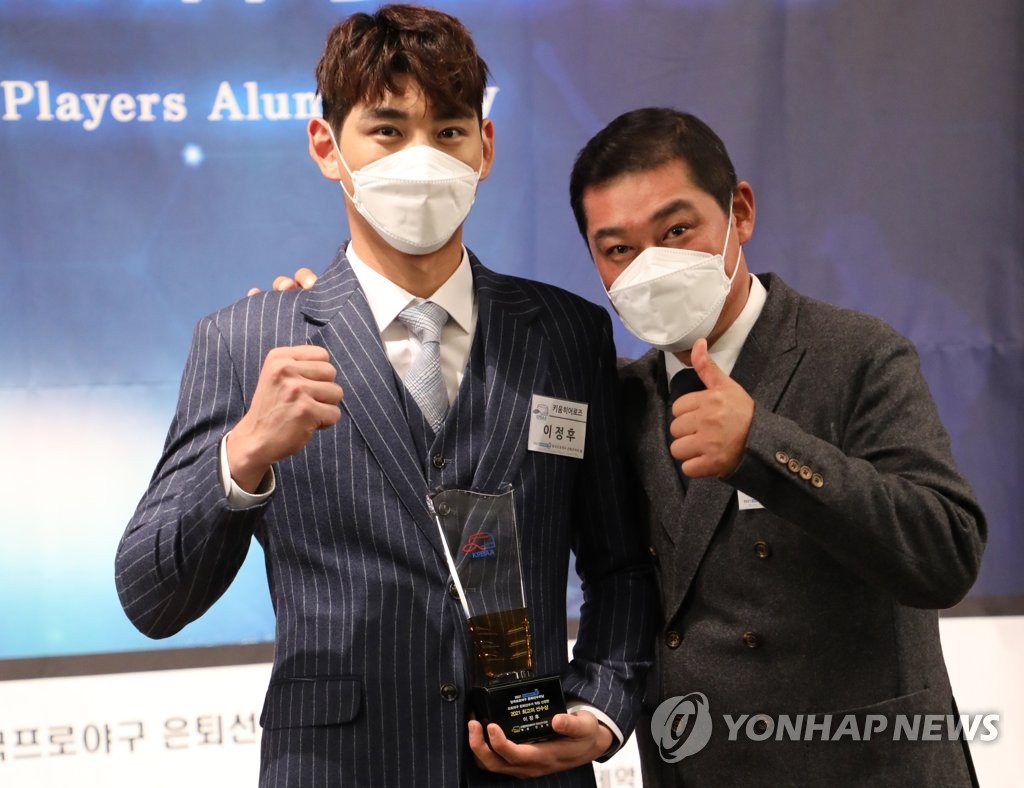| ▲ 바람의 아들과 손자 2일 강남구 리베라 호텔에서 열린 '제9회 한국프로야구 은퇴선수의 날' 행사에서 이종범 은퇴선수협 부회장이 최고의 선수상을 받은 아들 이정후(키움)와 기념촬영을 하고 있다. 2021.12.2 xyz@yna.co.kr [연합뉴스 자료사진] |