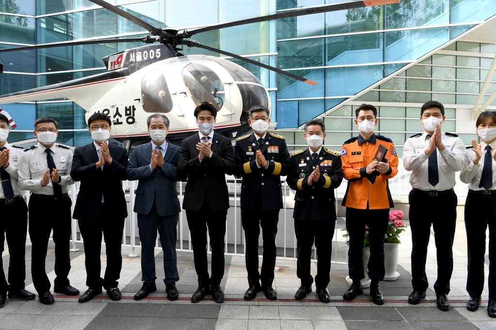 | ▲ 까치2호 국가등록문화재 등록 기념식 (서울=연합뉴스) 소방청은 29일 오후 서울 동작구 보라매안전체험관에서 소방헬기 '까치2호'가 국가등록문화재로 등록된 것을 기념하는 행사를 개최하고 앞으로 재난안전교육 자료로 활용하겠다는 계획을 밝혔다. 기념식에서 신열우 소방청장(오른쪽 5번째)이 기념사진을 촬영하고 있다. 2021.4.29.[소방청 제공. 재판매 및 DB금지] photo@yna.co.kr |