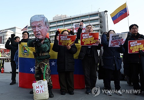 SEOUL, Jan. 5 (Yonhap) -- A coalition of civic groups on Monday chanted anti-U.S. slogans to protest against the U.S. capture of Venezuelan President Nicolas Maduro outside the U.S. Embassy in Seoul, condemning U.S. President Donald Trump over a military strike.