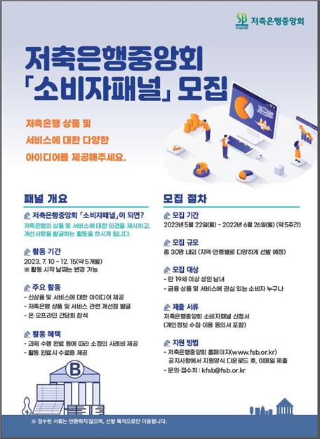 (서울=연합뉴스) 오지은 기자 = 저축은행중앙회는 2023년 소비자 패널을 모집한다고 25일 밝혔다.