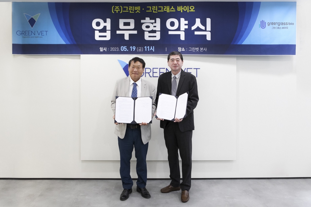 | ▲ 그린벳-그린그래스 바이오 "반려동물 식품 개발 협력" (서울=연합뉴스) 신승호 그린그래스 바이오 대표(왼쪽)와 박대우 그린벳 대표(오른쪽)가 19일 협약식에서 기념 촬영을 하고 있다. 2023.5.22 [그린벳 제공. 재판매 및 DB 금지] |