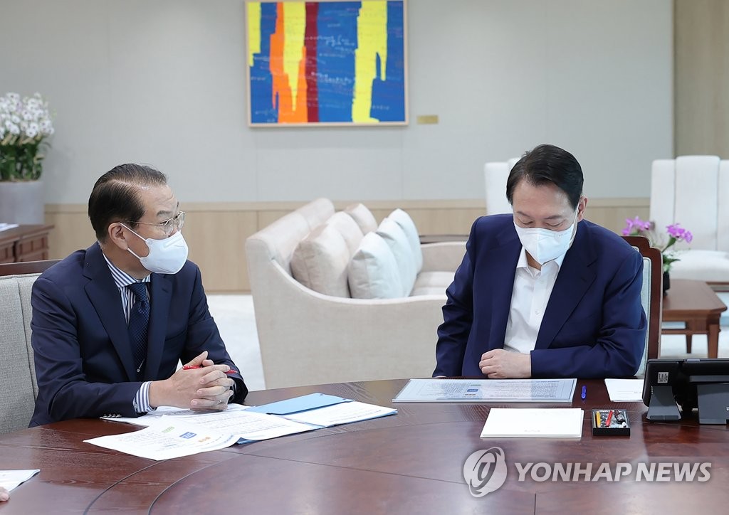| ▲ President Yoon Suk-yeol (R) receives a policy report from Unification Minister Kwon Young-se at the presidential office in Seoul on July 22, 2022, in this photo released by the office. (PHOTO NOT FOR SALE) (Yonhap) |