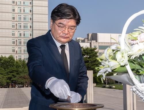 | ▲ Kim Yong-jin, deputy governor of Gyeonggi Province, burns incense in front of a memorial tower for national heroes in Suwon, south of Seoul, on July 28, 2022, after his inauguration ceremony, in this photo provided by the province. (PHOTO NOT FOR SALE) (Yonhap) |
