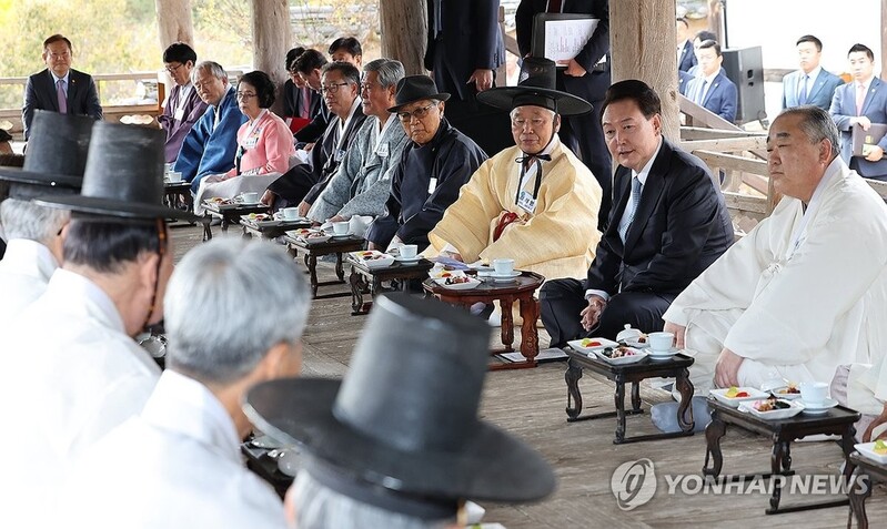 이어 "저 역시도 대통령으로서 제가 전통을 존중하고 우리 전통문화 창달에 노력하고 또 공적으로 맡은 바 소임을, 국민을 위해서 일하는 그 소임을 다 하겠다는 말씀을 유림 어르신들에게 올린다"고 덧붙였다.