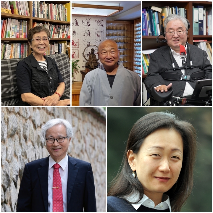 | ▲ 제26회 만해대상 수상자 왼쪽 위부터 시계방향으로 우쓰미 아이코 명예교수, 탄경스님, 이상묵 교수, 이민진 소설가, 유자효 시인. [동국대 제공. 재판매 및 DB 금지] |