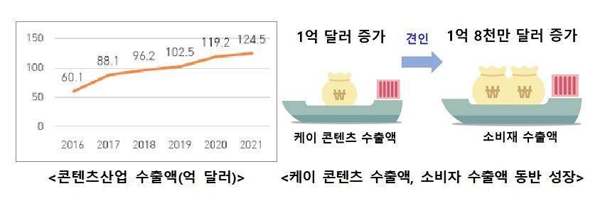 | ▲ 2016~2021년 콘텐츠산업 수출액(왼쪽)과 케이콘텐츠-소비재 수출액 동반성장 [문화체육관광부 제공] |