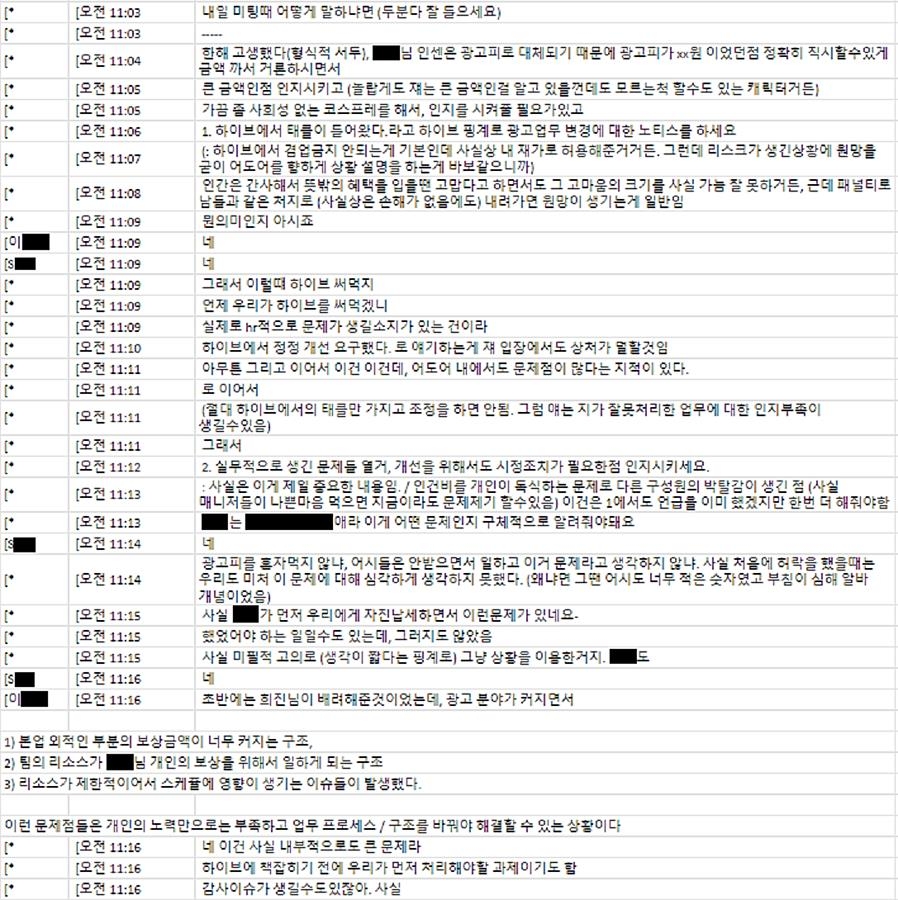 또 "이건 사실 내부적으로도 큰 문제라 하이브에 책잡히기 전에 우리가 먼저 처리해야 할 과제이기도 함"이라며 "감사 이슈가 생길 수도 있잖아, 사실"이라고도 했다.