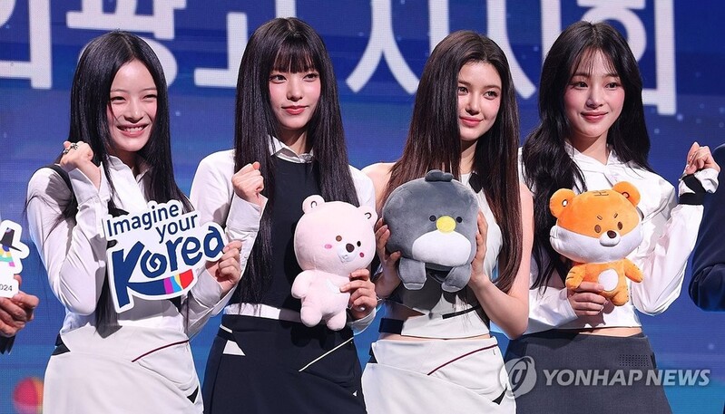 ▲ 2024 한국관광 명예 홍보대사 위촉식서 기념 촬영하는 뉴진스 (서울=연합뉴스) 강민지 기자 = 그룹 뉴진스 멤버 하니(왼쪽부터), 해린, 다니엘, 민지가 11일 오전 서울 용산구 그랜드하얏트 호텔에서 2024 한국관광 명예 홍보대사로 위촉된 후 인형을 들고 기념 촬영하고 있다. 2024.7.11 [공동취재] mjkang@yna.co.kr