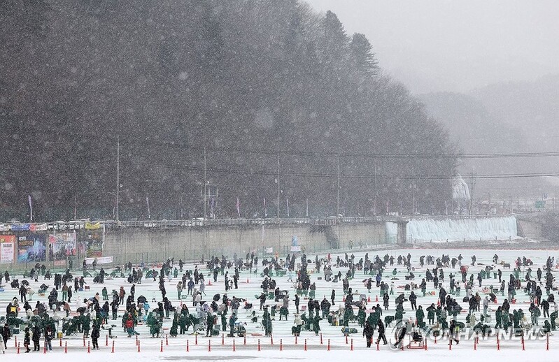 축제장 일대는 알록달록한 겨울 외투 차림의 낚시꾼들로 물들었고 낚시터 근처 주차장과 이면도로는 주차할 곳을 찾는 차량 행렬로 가득했다.