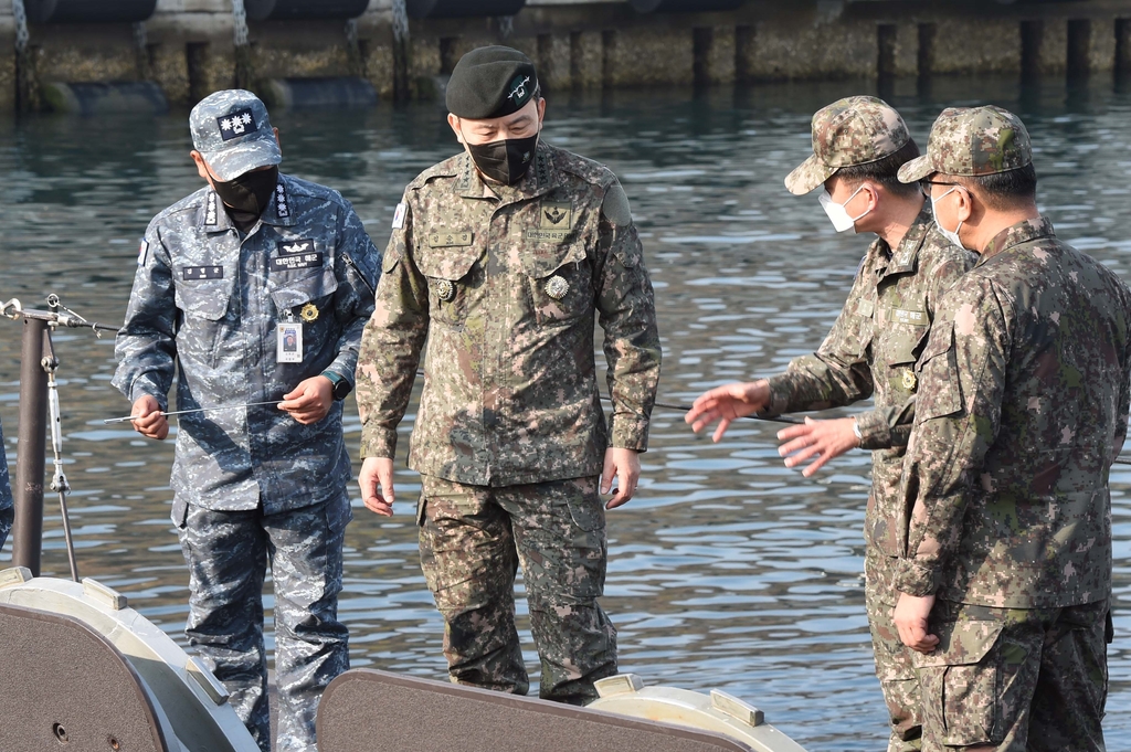 Joint Chiefs of Staff (JCS) Chairman Gen. Kim Seung-kyum inspected the Navy's Submarine Force Command in Changwon, 398 kilometers south of Seoul, as well as the ROK Fleet and the Air Mobility & Reconnaissance Command in Busan, 450 kilometers south of the capital. ROK stands for South Korea's official name, Republic of Korea.