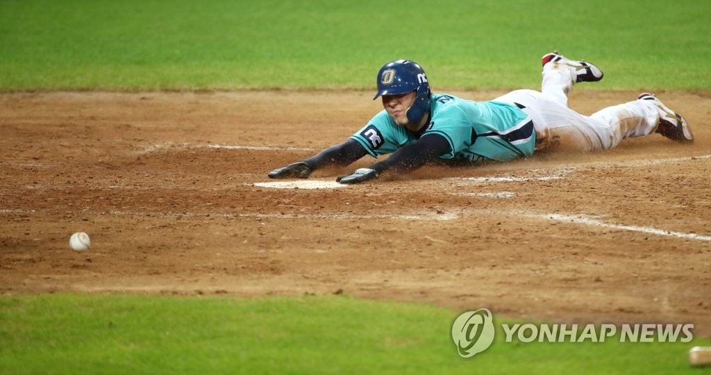 | ▲ In this file photo from Aug. 21, 2020, Kim Seong-uk of the NC Dinos scores against the Kia Tigers in the top of the ninth inning of a Korea Baseball Organization regular season game at Gwangju-Kia Champions Field in Gwangju, 330 kilometers south of Seoul. (Yonhap) |