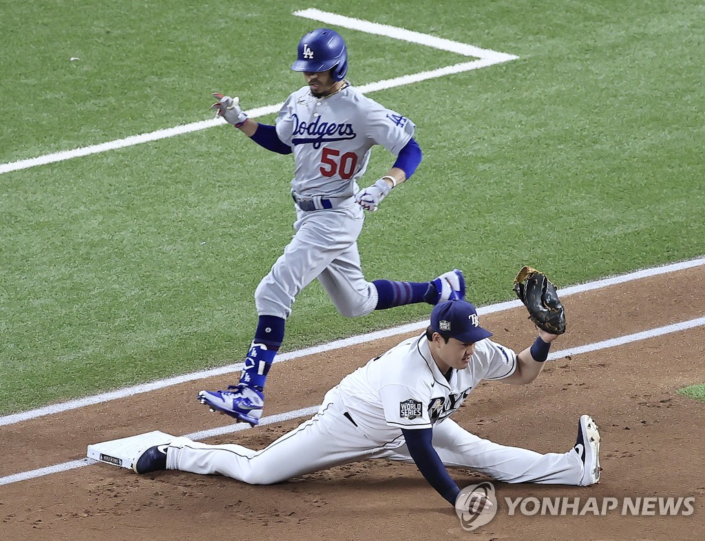 | ▲ In this EPA file photo from Oct. 23, 2020, Choi Ji-man of the Tampa Bay Rays (R) does a split at first base to field a throw from shortstop Willy Adames and put out Mookie Betts of the Los Angeles Dodgers during the top of the first inning of Game 3 of the World Series at Globe Life Field in Arlington, Texas. (Yonhap) |