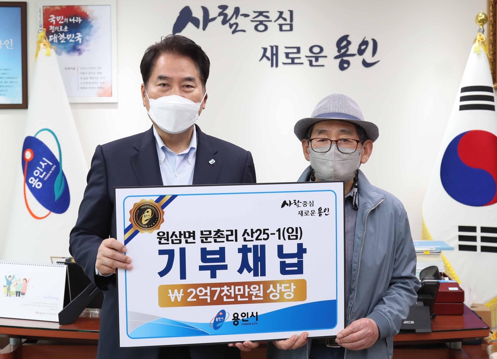 이에 백군기 시장은 "우리 사회에서 기부나 환원에 대한 인식이 아직 부족한 현실인데, 조건 없이 땅을 기부해 주셔서 감사드린다"며 "기부자의 뜻을 고려해 시민들이 이용할 수 있도록 활용방안을 모색하겠다"고 화답했다.