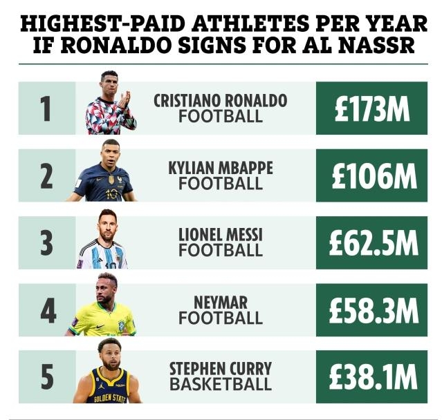 호날두의 이적을 가정하고 더 선이 추정한 세계 스포츠 스타 최고 연봉 순위를 보면, 호날두, 음바페, 리오넬 메시(35), 네이마르(30·이상 파리 생제르맹) 등 축구 스타 4명이 1∼4위를 휩쓸었다. 메시는 6천250만파운드(984억원), 네이마르는 5천830만파운드(918억원)를 받는 것으로 나타났다.