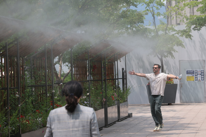A foreigner cools himself under a cooling mist system near Seoul Square in downtown Seoul on June 5, 2024, when the day's peak temperature reached 31 C. (Yonhap)