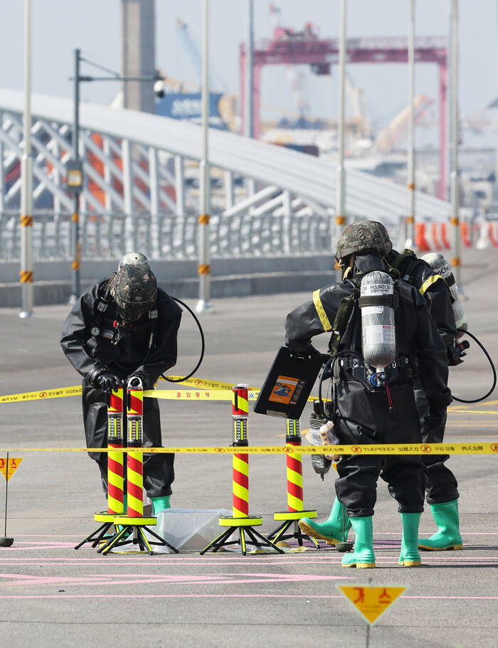 South Korean soldiers take part in chemical, biological and radiological (CBR) warfare training at an international ferry terminal in Pyeongtaek, south of Seoul, on March 11, 2025, under a scenario where an unidentified projectile has fallen. The drill, led by the Navy's 2nd Fleet Command, is part of the annual military drills, the Freedom Shield, that Seoul and Washington launched the previous day, to enhance their combined defense capabilities against North Korean military threats. (Yonhap)