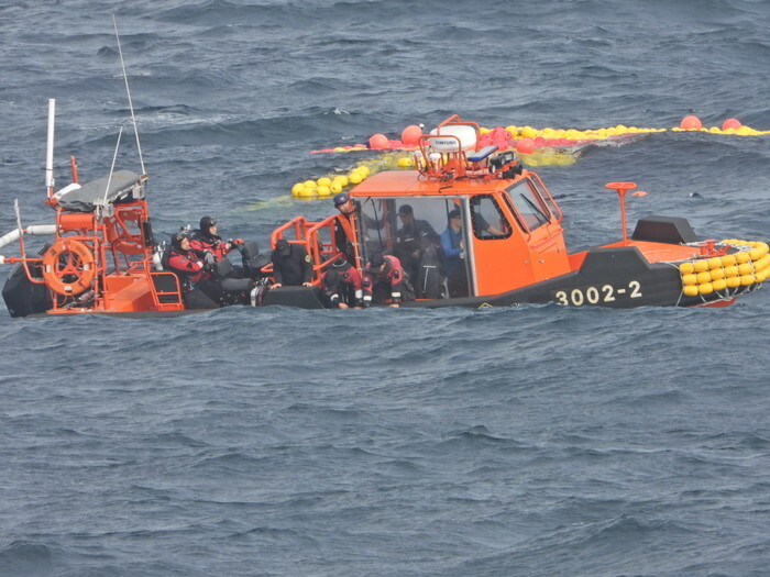 A Coast Guard vessel searches for missing crew members aboard the 129-ton Geumseong that sank off Jeju Island the previous day, in this photo provided by the Jeju Coast Guard on Nov. 9, 2024. (PHOTO NOT FOR SALE) (Yonhap)