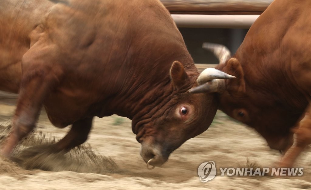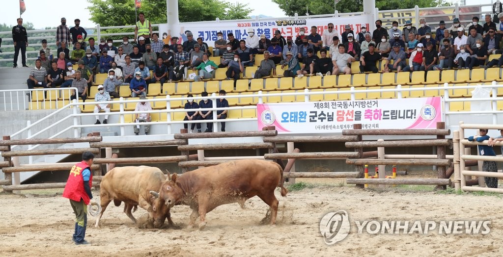 | ▲ 3년 만에 개최 '제33회 의령 전국 민속 소 힘겨루기' (의령=연합뉴스) 김동민 기자 = 10일 오후 경남 의령군 의령읍 민속 소싸움경기장에서 열린 '제33회 의령 전국 민속 소 힘겨루기 대회'에 참가한 소 2마리가 힘겨루기를 하고 있다. 이번 대회는 코로나 확산으로 3년 만에 열렸다. 2022.6.10 image@yna.co.kr |