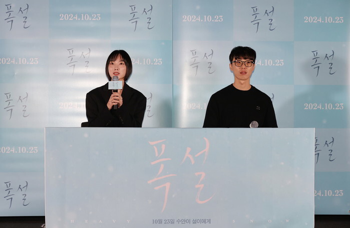 South Korean actress Han Hae-in (L), who stars in the new movie "Heavy Snow," greets reporters along with director Yoon Soo-ick (R) during a publicity event in Seoul on Oct. 11, 2024. The movie will be released in South Korea on Oct. 23. (Yonhap)