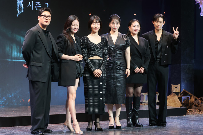 The stars of the new movie "Hellbound 2" an original film by Netflix -- Lim Sung-jae, Moon So-ri, Kim Shin-rok, Kim Hyun-joo, Moon Geun-young and Kim Sung-cul (L to R) -- pose for a photo during a publicity event in Seoul on Oct. 21, 2024. The movie will be released worldwide on Oct. 25. (Yonhap)
