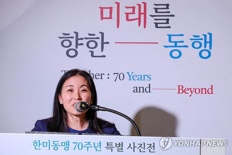 | ▲ Joy Sakurai, deputy chief of mission at the U.S. Embassy in Seoul, delivers a congratulatory speech at the opening ceremony of a special photo exhibition celebrating the 70th anniversary of the South Korea-U.S. alliance in Seoul on Oct. 6, 2023. (Yonhap) |