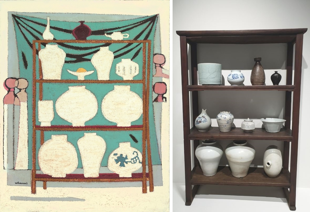 | ▲ '항아리'(1956)와 작가가 소장했던 도자기들과 선반 항아리 이미지는 삼성문화재단 제공, 재판매 및 DB금지, ⓒWhanki Foundation·Whanki Museum |