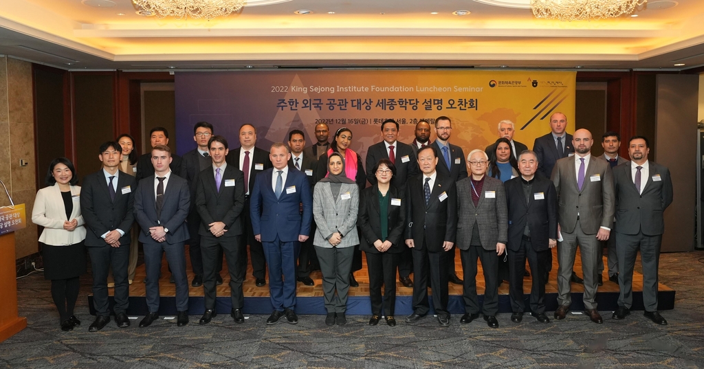 ▲ 세종학당재단(이사장 이해영)은 16일 서울 중구 롯데호텔에서 30개국 주한 외국 공관 관계자를 초청해 현지에서 한국어·한국문화를 보급하는 세종학당 사업 설명회를 개최했다. 이 중에는 세종학당이 없는 동티모르, 몰타, 부탄, 온두라스, 이라크, 카메룬 등 14개국도 포함됐다. 세종학당은 학당 운영을 희망하는 각국의 대학 및 정부 기관은 오는 30일까지 세종학당 통합업무관리시스템 누리집(nbms.ksif.or.kr)으로 신청받아 심사해 내년 6월중 선정 결과를 발표한다. (서울=연합뉴스)
